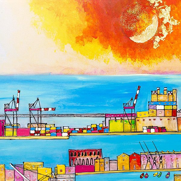 Colori sovrapposti al colore per tessere frammenti di vite incantate. Genova di porto e di cielo, anima in festa per l'arrivo di bastimenti, finestre arabe e giardini imprevedibili, se abbiamo cuore e innocenza è questo che vediamo.